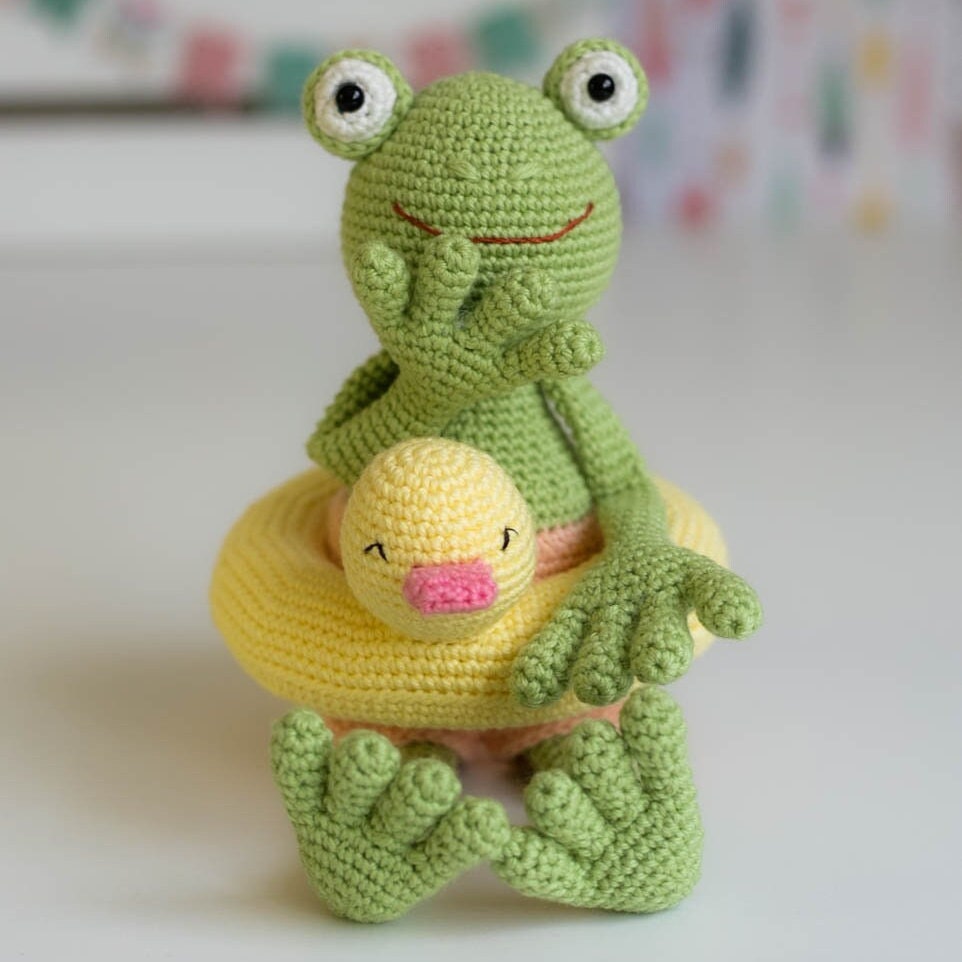 Also, if you like larger plush toys, you can crochet a frog from plush yarn according to the pattern. You will get a big and charming frog.
