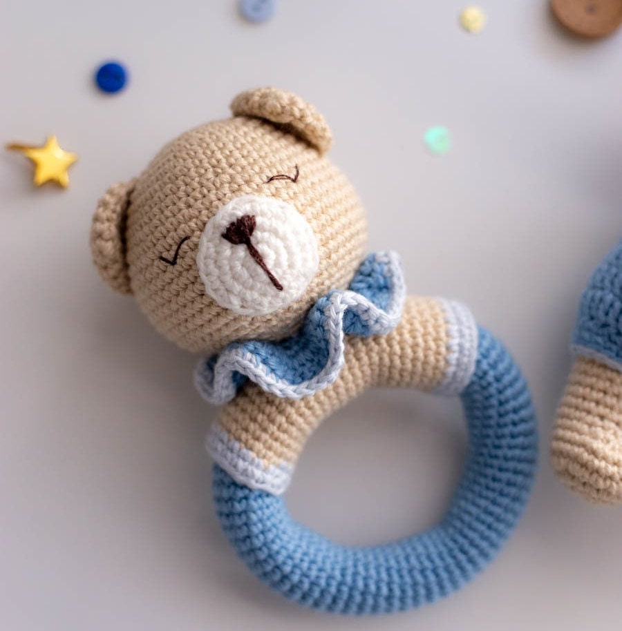 Using this pattern, you can crochet two toys – A Bear rattle and a Bear toy.