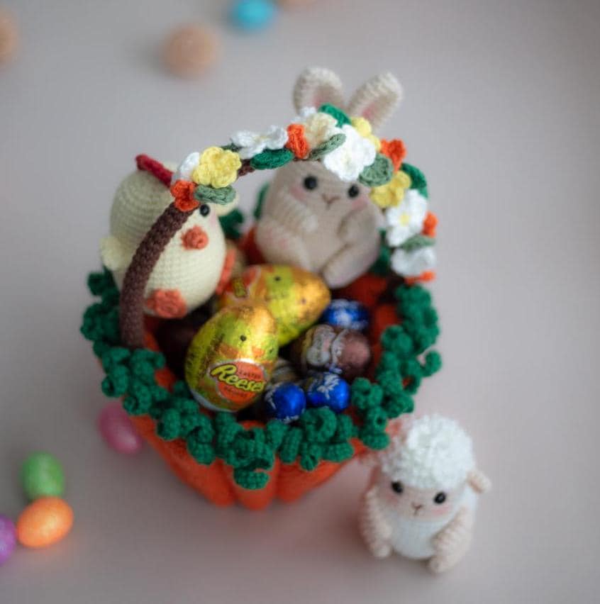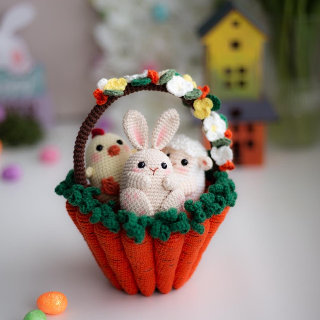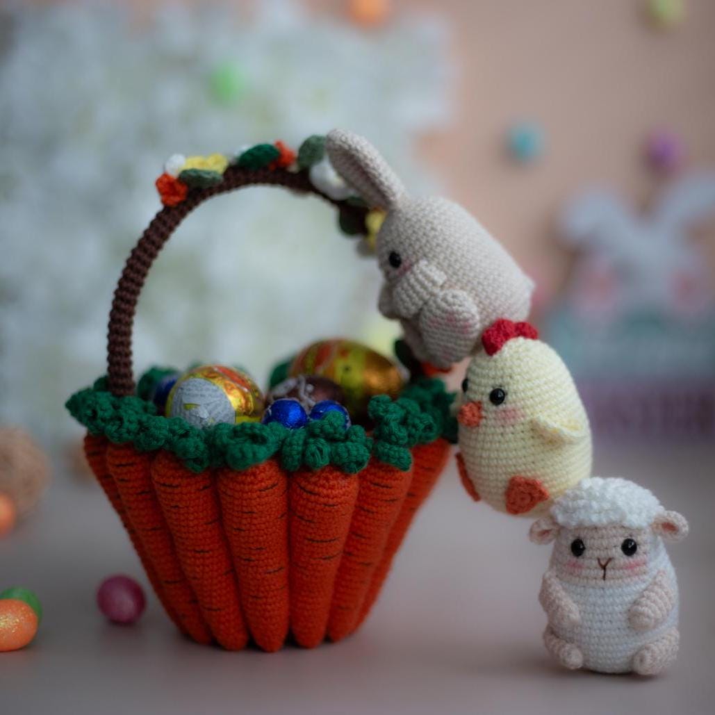 Amigurumi Crochet Easter Basket with Bunny, Sheep & Chicken. Crochet Pattern in PDF